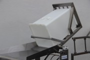The Camembert-making container is used to pour the curd-whey mixture - using a bin turner and a mould distributer - directly into moulds placed on trays with mats. The conveyor moves the trays after filling.